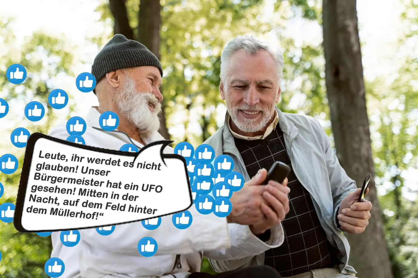 Nun springen wir in die Gegenwart, ins Jahr 2023. Sie leben in derselben kleinen Gemeinde, aber das Internet ist allgegenwärtig. Ihre Nachbarin erzählt die gleiche Geschichte, diesmal auf Facebook: „Leute, ihr werdet es nicht glauben! Unser Bürgermeister hat ein UFO gesehen! Mitten in der Nacht, auf dem Feld hinter dem Müllerhof!“