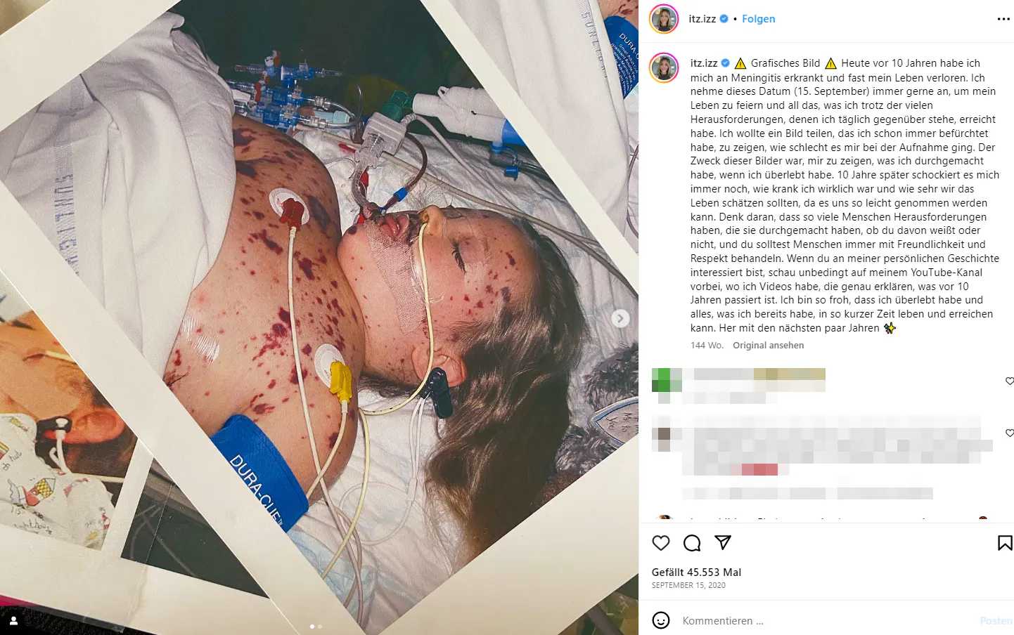 Auf Instagram hat sie dieses Bild, am 15.9.2020 von sich gepostet und schreibt sinngemäß: "Heute, genau zehn Jahre nachdem ich mich mit Meningitis infizierte und fast mein Leben verlor, feiere ich mein Leben und all das, was ich trotz der vielen täglichen Herausforderungen erreicht habe. Ich habe mich entschieden, ein Bild zu teilen, vor dessen Veröffentlichung ich immer Angst hatte. Es zeigt mich in einem bedenklichen Zustand, aber der Zweck dieses Bildes ist es, mir und anderen zu zeigen, was ich überstanden habe.