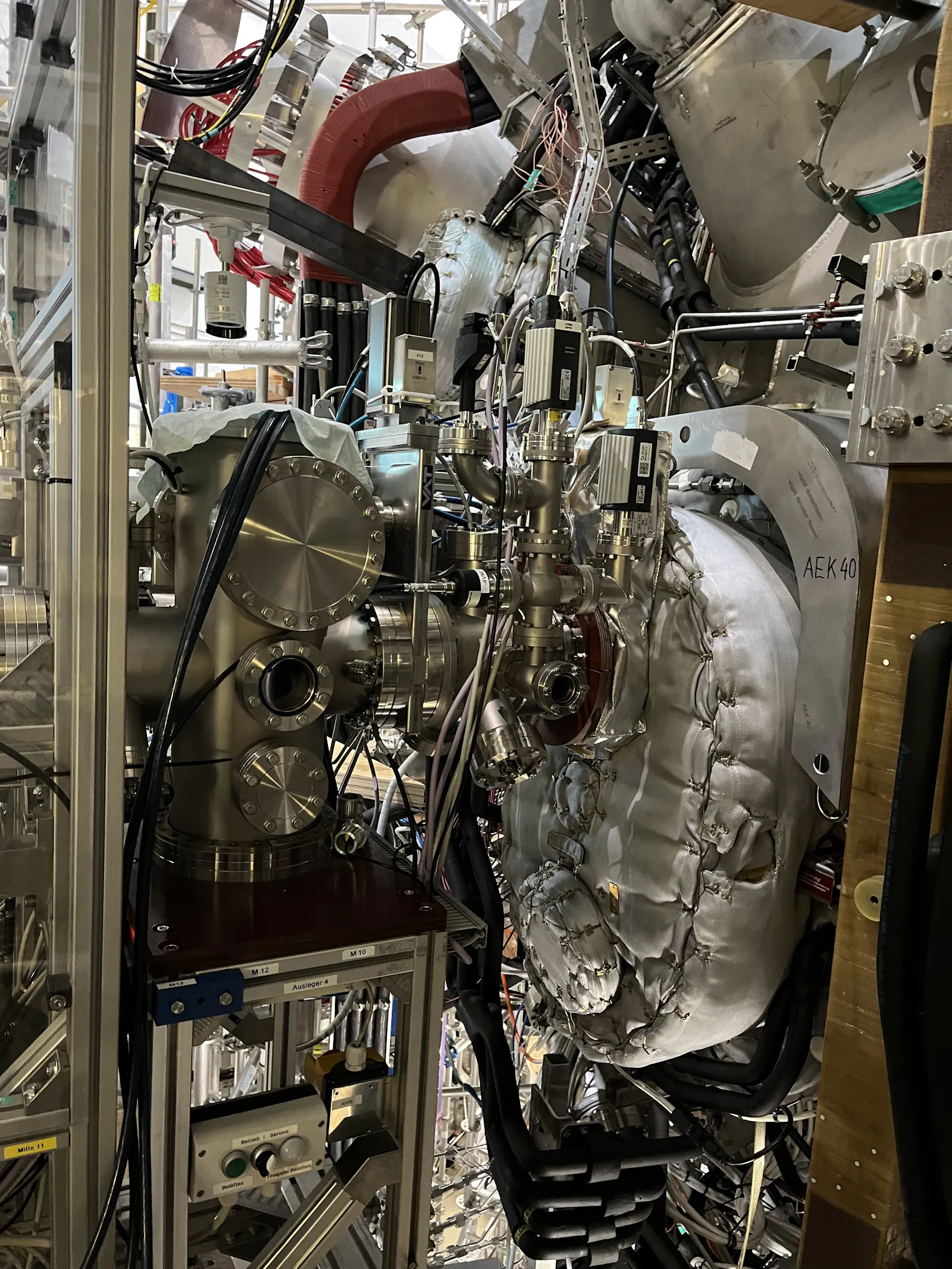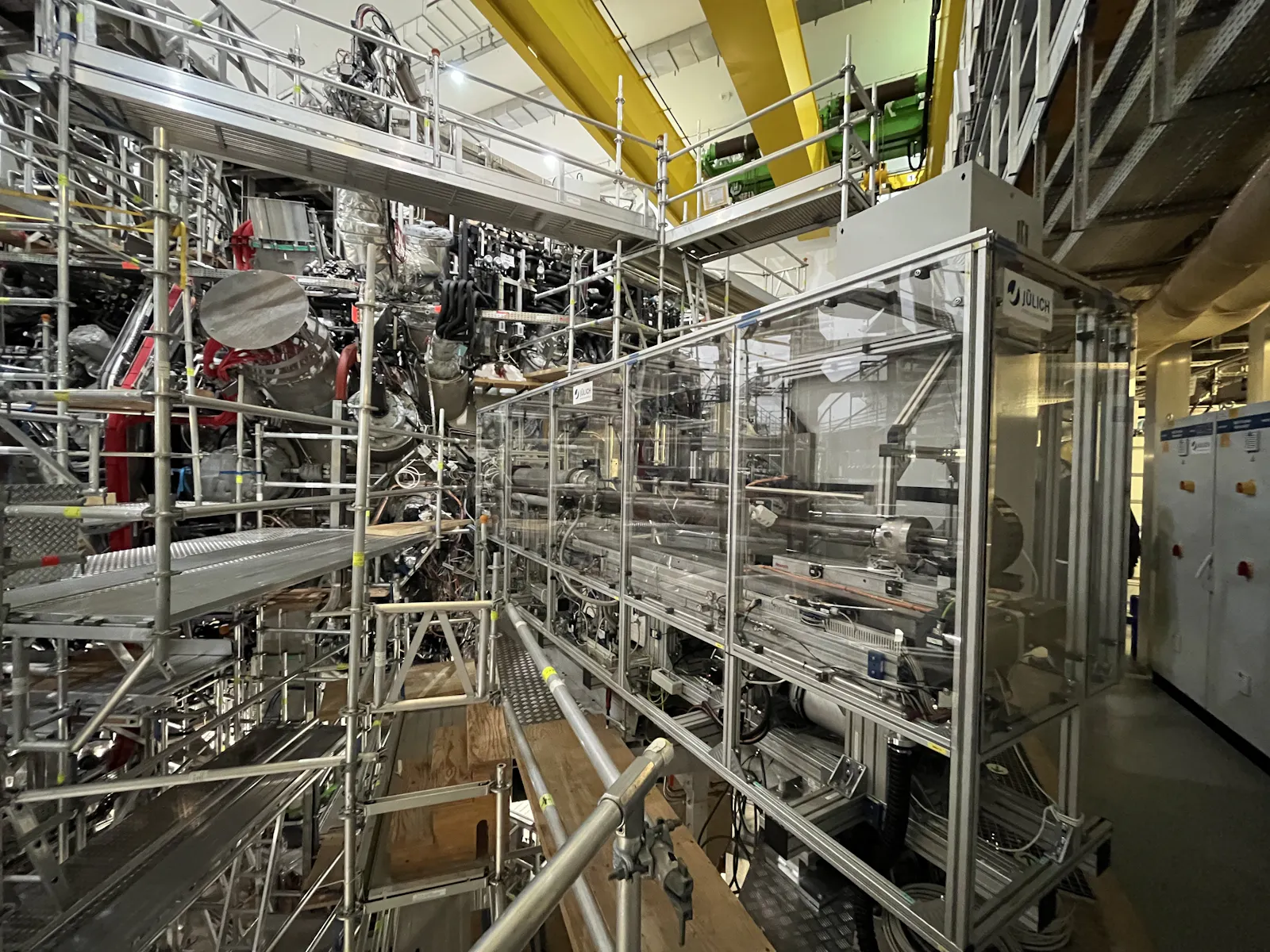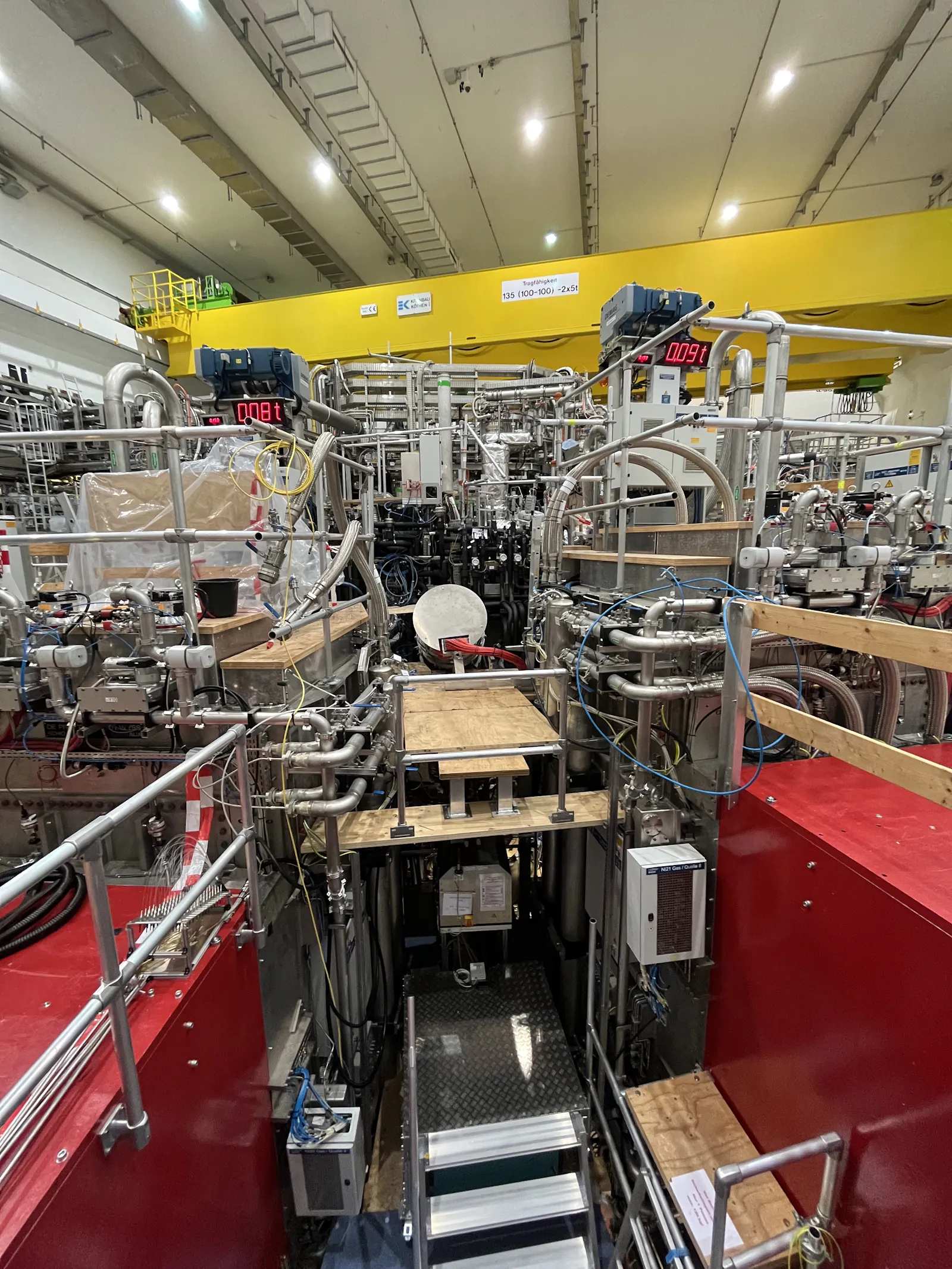Die roten Displays sind Waagen, die anzeigen ob der 3 Tonnen schwere Kupferblock, der ein Plasmaheizungs-Experiment (die roten Kisten) von der Plasmakammer trennt gerade angehoben wird: