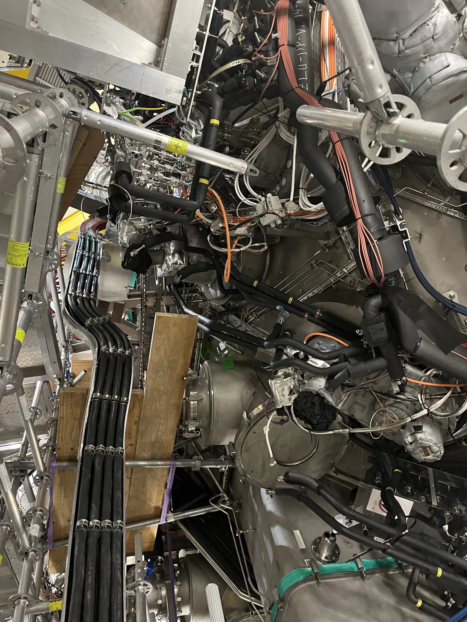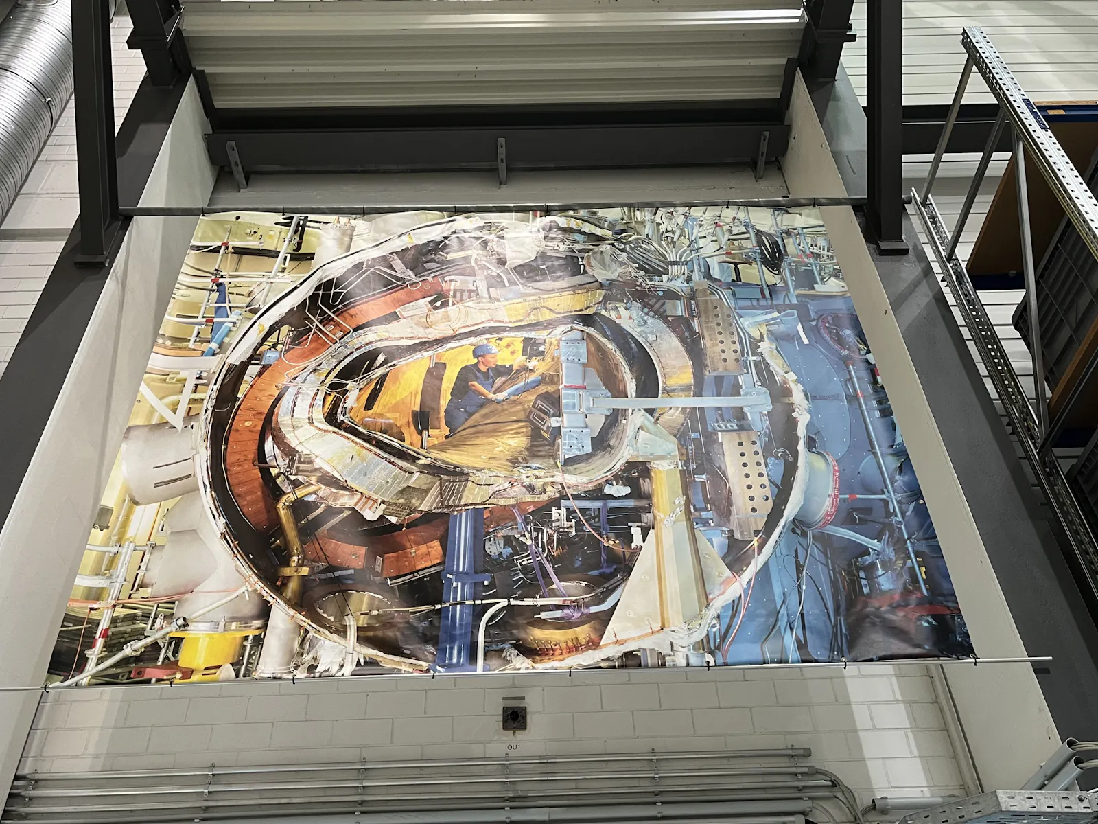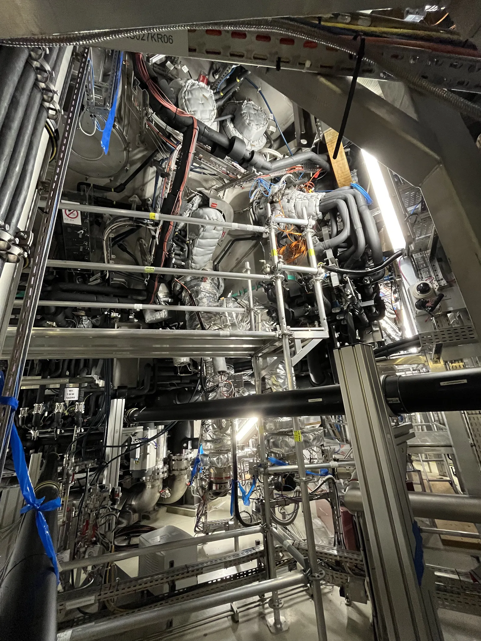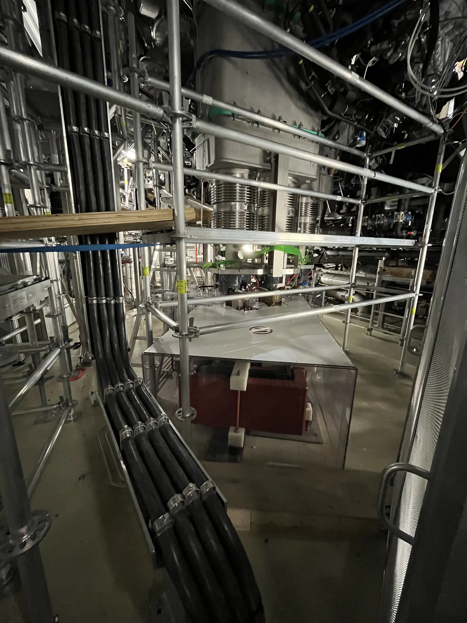 Die roten Displays sind Waagen, die anzeigen ob der 3 Tonnen schwere Kupferblock, der ein Plasmaheizungs-Experiment (die roten Kisten) von der Plasmakammer trennt gerade angehoben wird: